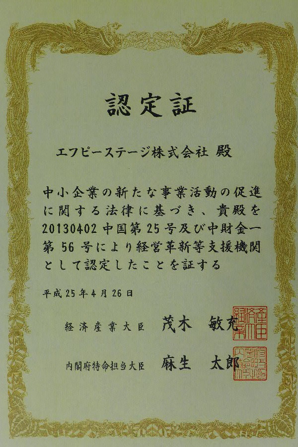 エフピーステージ株式会社は経営革新等支援機関に認定されました。保険代理店でこの認定を受けたのはエフピーステージ株式会社が日本初だろうと思います。
